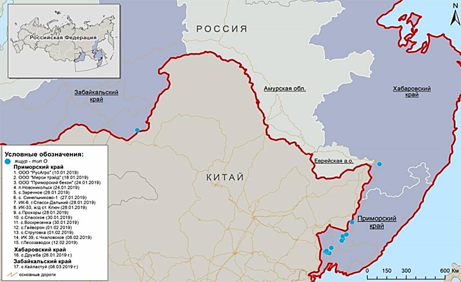На сегодняшний момент Россия имеет статус “зоны, свободной от ящура без применения вакцинации”. В 2018 году было зарегистрировано 5 вспышек ящура в Забайкальском крае, в 2019-ом – 17 вспышек в Приморском, Хабаровском и Забайкальском крае.