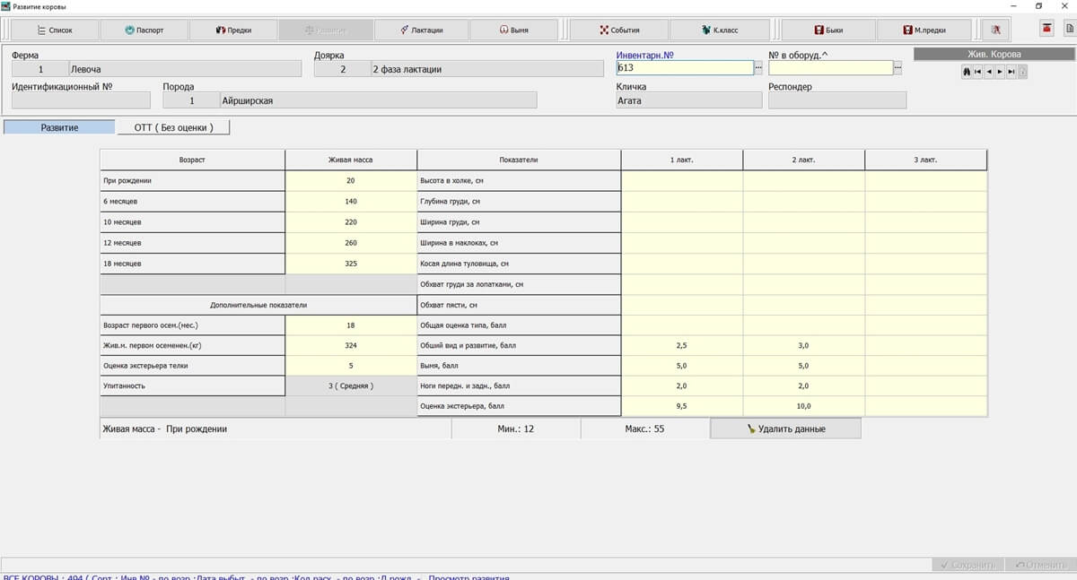 4. вкладка «Развитие», где отмечаются промеры животного: высота в холке, глубина груди, ширина груди, ширина в маклаках, косая длина туловища, обхват груди за лопатками и обхват пясти.