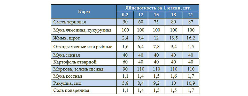 Рацион для несушки подбирают с учетом ее яйценоскости, суточные порции продуктов указаны в таблице: