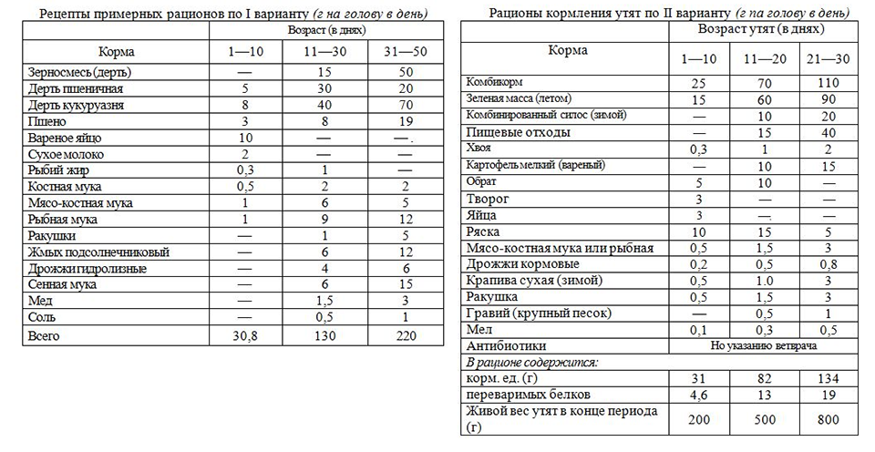 Таблица с двумя вариантами рационов для молодых уток (до двух месяцев)