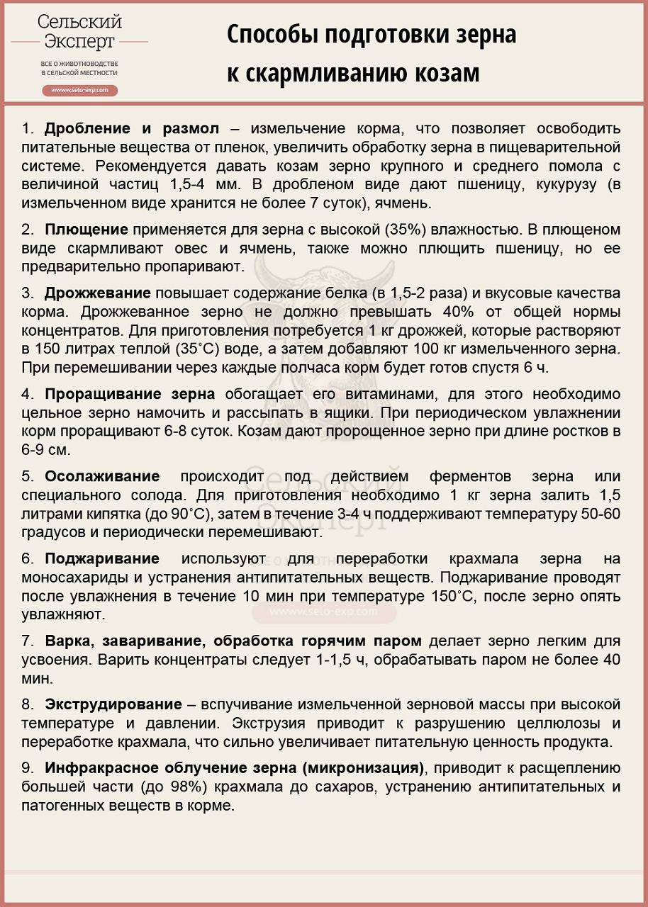 Зерно, предназначенное для коз, дробят, жмыхи измельчают, отруби хорошо смачивают водой. Лучше всего концентраты давать животным в виде смеси.