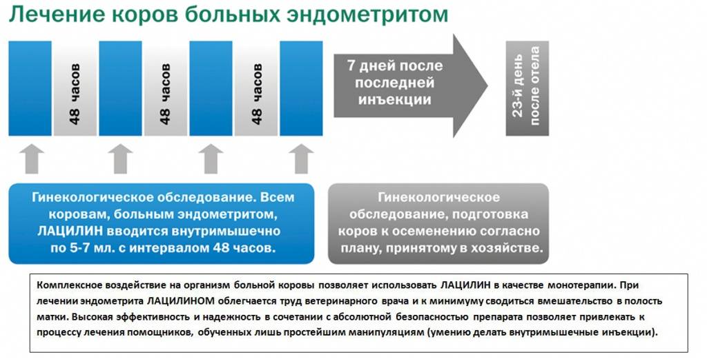 После проведённого курса лечения катарального эндометрита следует выждать 7 дней, после чего провести гинекологическое обследование. При отсутствии воспалительного процесса в полости матки корову готовят к осеменению в соответствии с планом, принятым в хозяйстве. При наличии хронического эндометрита курс лечения повторяют, но уже с однократным введением в полость матки антибактериального препарата. Хронический и субклинический эндометрит у коров проявляется наличием в слизи слизи- сто-гнойных выделений (СГВ). Иногда СГВ проявляются в начале охоты, но чаще всего в конце охоты при повторном осеменении. В таких случаях ЛАЦИЛИН применяют 3-х кратно с интервалом 48 часов.