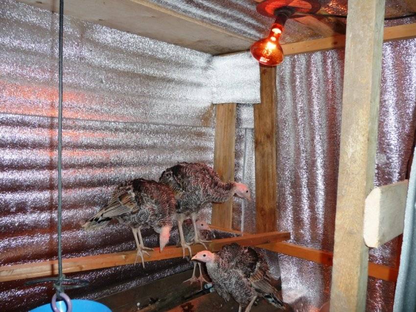 Маленькие индюшата нуждаются в постоянном освещении, поскольку они плохо видят и при слабом свете не смогут найти кормушку, а рефлекс на место кормления у них ещё не выработался. Цыплята от одного до трёх дней нуждаются в повышенной температуре, поэтому в брудере установлен обогреватель. В небольшой конструкции это может быть лампа накаливания. Поскольку температура постепенно должна понижаться, к источнику тепла следует подключить терморегулятор.