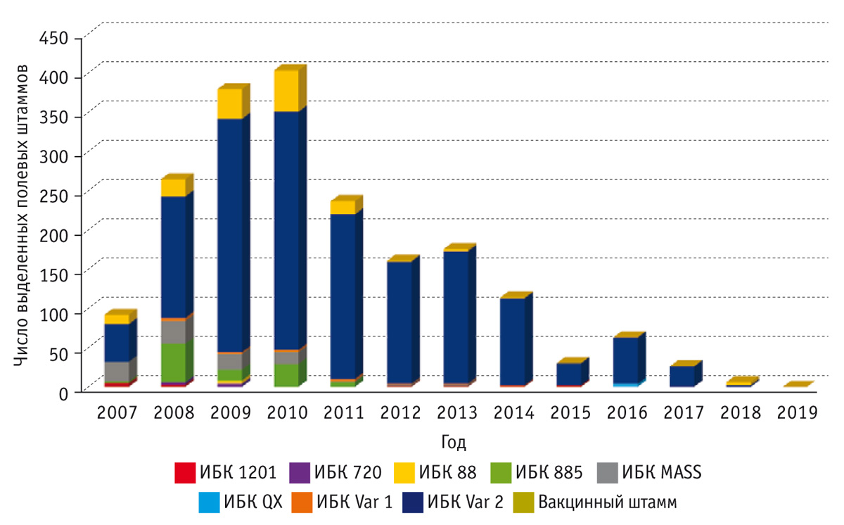 Вирус ИБК постоянно изменяется, и это серьезная проблема для птицеводов во всем мире. Появление мутаций и перестройка вируса ИБК с формированием его новых генотипов, характеризующихся различной степенью патогенности и обладающих разными антигенными свойствами, обусловлены природными свойствами РНК-содержащего вируса ИБК с гипервариабельной областью (S1). С 1990‑х годов новые варианты генотипов вируса ИБК (793B, QX и IS/1494/06) циркулируют во многих странах.