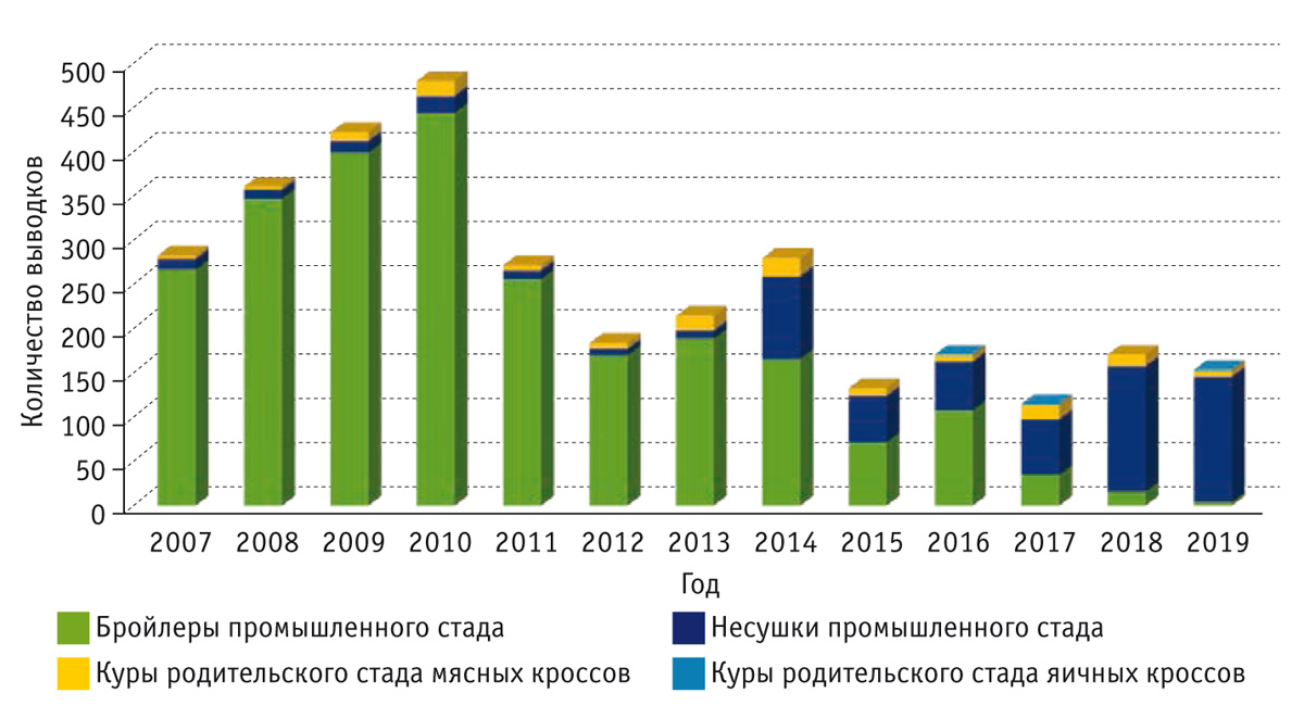 В 2014г. вакцина TAbic IB VAR 2-06 была зарегистрирована для применения на промышленных комплексах. Ее используют для иммунизации несушек и птицы родительского стада с 1‑го дня жизни с последующей ревакцинацией поголовья этой же вакциной на 14‑й день и в дальнейшем через каждые 5–7 недель. Результаты исследований показали, что благодаря последовательной иммунизации птицы мясных и яичных кроссов вакциной TAbic IB VAR-206 частота клинических случаев ИБК в Израиле значительно сократилась (рис.1–3).