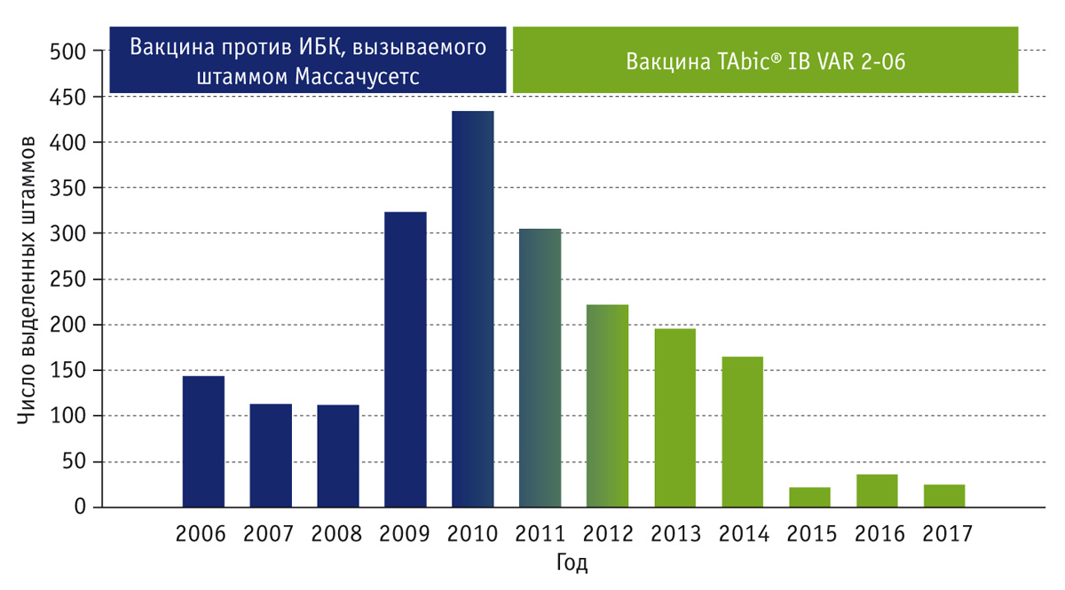 В 2009г. на рынке была представлена вакцина TAbic IB VAR 2-06 для бройлеров. Препарат использовали согласно программе вакцинации: в 1‑й день жизни методом крупнокапельного спрея, на 12–14‑й день методом крупнокапельного спрея или аэрозольно.