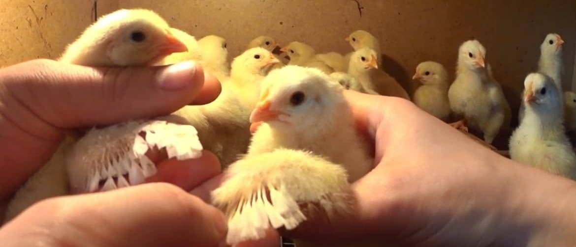 Наибольшую сложность представляет определение пола суточного выводка, поскольку основные внешние отличительные признаки еще не сформированы. Наиболее распространенным как на птицефабриках, так и в условиях домашних хозяйств является метод определения по форме крыльев. Известно, что курочки оперяются раньше петушков. При этом у петушка размах крыла шире, а маховые перья крупнее. Именно по этому признаку с достоверностью 65-80% можно отличить самцов от самочек.