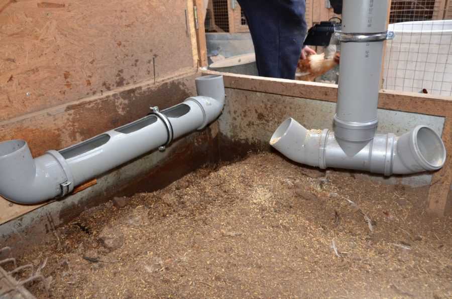 Подобная конструкция хороша, если птицы в хозяйстве немного. В противном случае, соединительное колено можно заменить ещё одной трубой, закрепив её параллельно полу. Доставать корм из горизонтальной трубы птицы смогут через отверстия в ней.