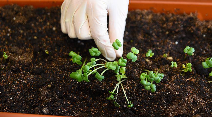Слишком густо посаженая зелень не сможет нормально расти, поэтому ее потребуется проредить. В таре нужно оставить только сильные и здоровые экземпляры. Такие работы следует запланировать на момент формирования 3-4 листков. Однако некоторые виды, например, укроп или петрушку прореживать необходимости не будет.