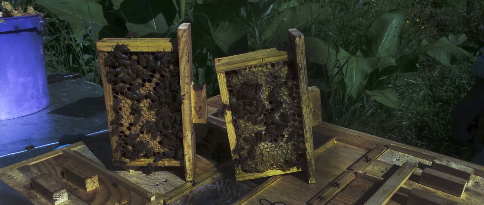 Осмотр гнезд. Процедура возможна без применения дыма, пчелы миролюбивы и даже не останавливают работу.