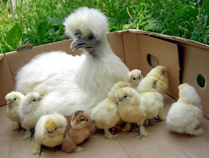 Китайская курица — заботливая мама и отличная наседка. И если не собирать регулярно яйца, то она с удовольствием садится их высиживать, невзирая на время года. В этом случае самка прекращает нестись и полностью посвящает себя выведению потомства.