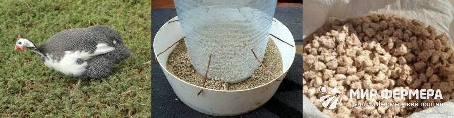 Кормят цесарок 2 – 3 раза в день. Концентраты обычно дают утром и вечером. Днем птицам скармливают траву и влажные мешанки.