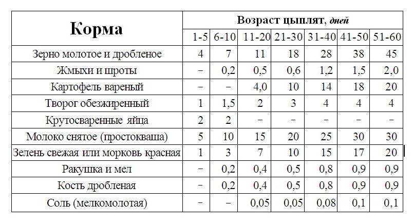 Таблица показывает полноценные нормы для молодняка в возрасте 1-1,5 месяца, они подходят и для двухмесячных кур и петухов. В этом возрасте должно проводится 4-5 дневных кормлений. Также важен правильный уход, обязателен регулярный выгул птиц.