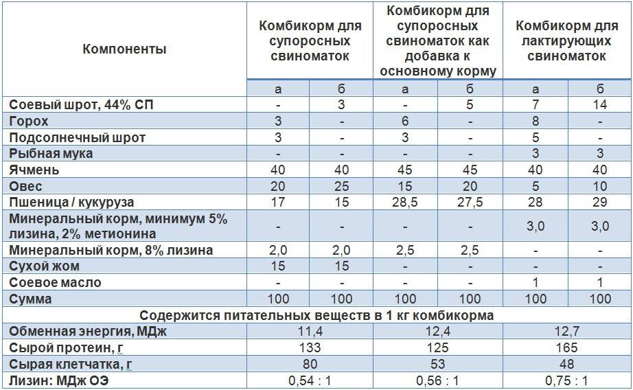 Процентное содержание кормового сырья для формирования комбикормов для свиноматок, находящихся в различных продуктивных фазах приведена в таблице.