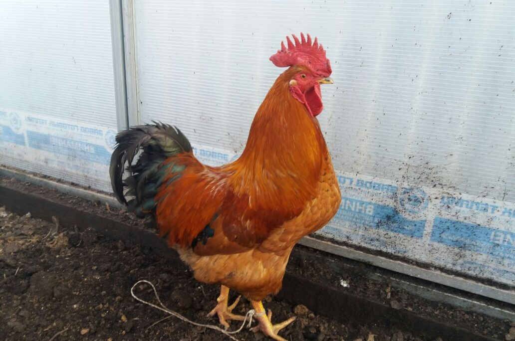 По внешнему виду куры и петухи отличаются друг от друга комплекцией и окрасом. У петухов преобладает в оперении красный цвет , хвост – черный. Желтый крепкий клюв дополняет общий яркий вид. Шея обрамлена мощным воротником, который ниспадает до плеч. Спина петуха широкая, длинная, глаза выпуклые.