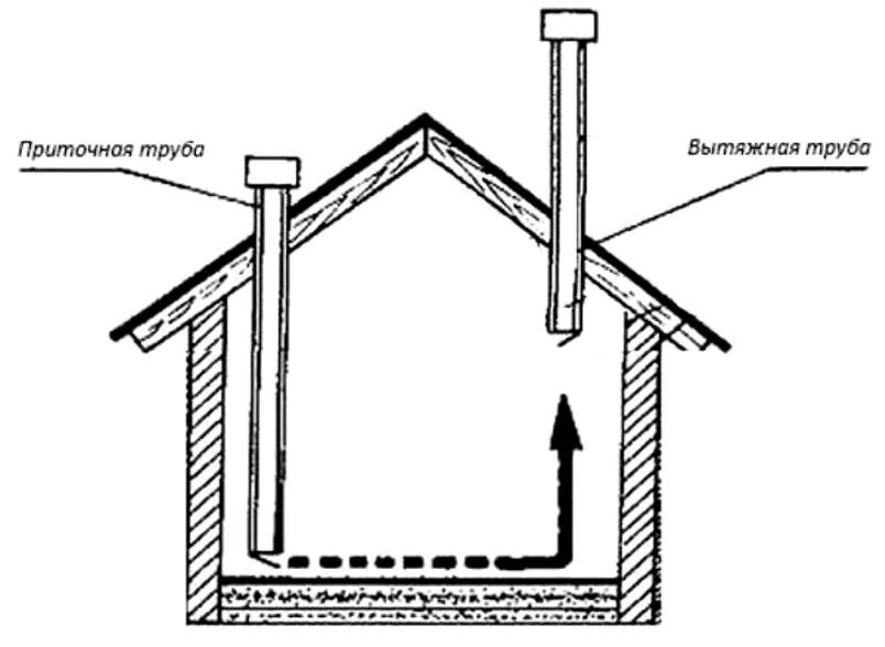 Несколько пластиковых труб помогут решить проблему. С их помощью сооружают приточно-вытяжную вентиляцию. Трубки выводятся наружу через кровельную часть. Вытяжная прикрепляется под потолком, располагаясь немного выше конька. Приточная не должна касаться поверхности пола и доходить ближе чем на 30 см.