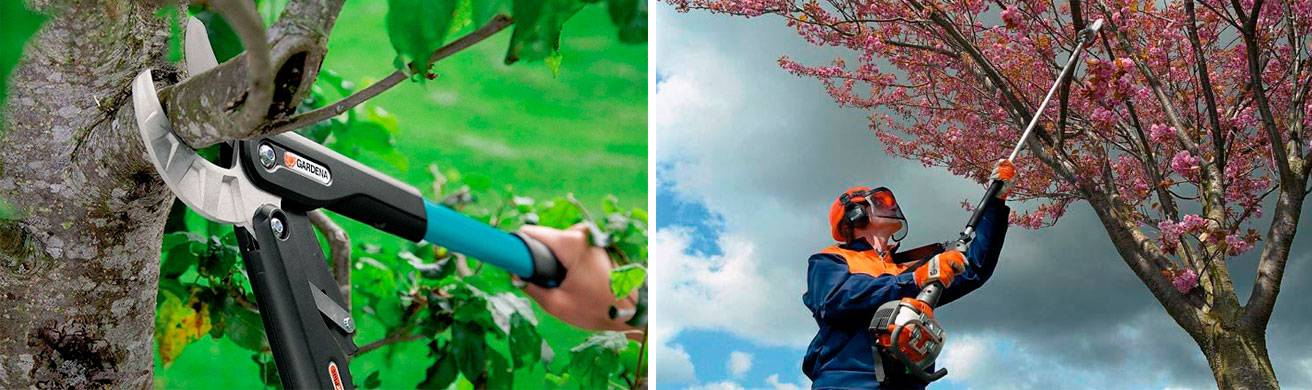 Сучкорез приводится в действие вручную или с помощью механизма, работающего от бензина либо от электричества.