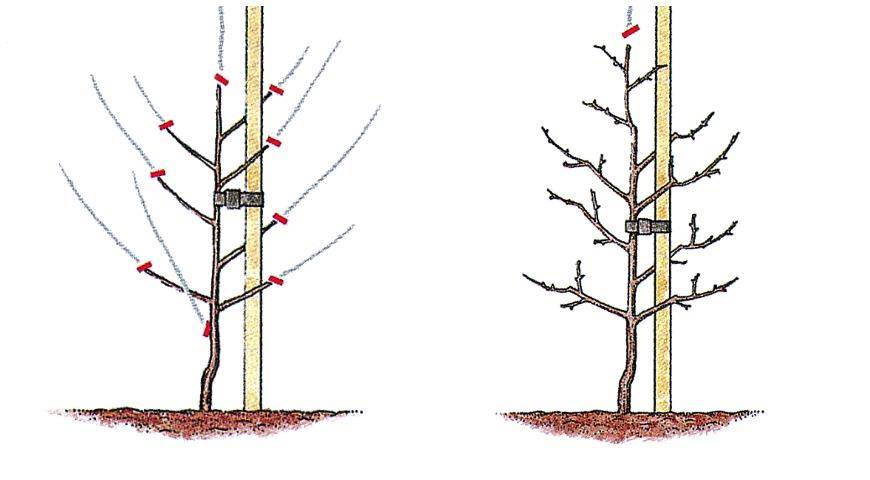 Штамб при посадке срезают до 80‒90 см. При наличии боковых ветвей выбирают до 5-ти наиболее развитых ответвлений. Их укорачивают, подрезая нижние на четверть длины, а расположенные выше делают короче.
