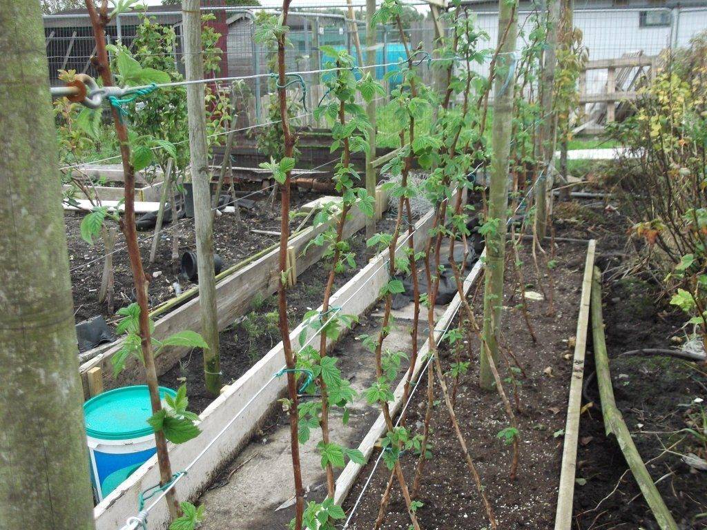 Чтобы упростить уход за высокорослым ягодником, вдоль рядов малины сорта желтый гигант устанавливают прочную опору в виде металлических прутьев или деревянных брусков. Длина шпалеры равна или слегка превышает длину взрослых побегов. К вкопанным столбикам в 3 ряда подвязывают толстую (0,5 см) проволоку, к которой прикрепляют побеги: