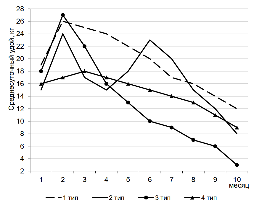 А.С. Емельянов выделил четыре типа коров по характеру лактационных кривых (рис. 2).