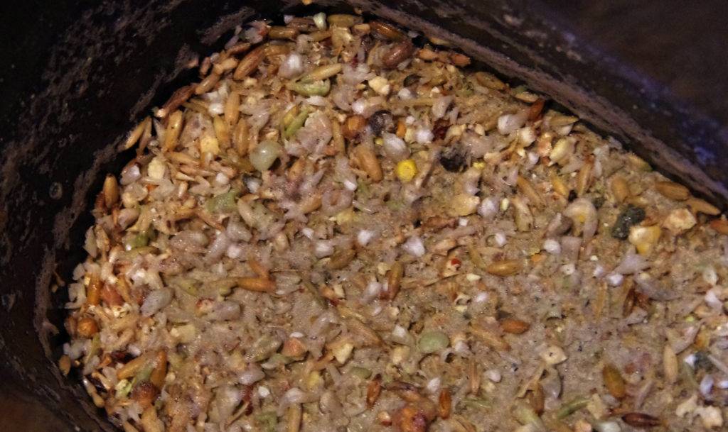 - Высыпать измельчённые зерна или их смеси, отруби, соль, муку (рыбную или костную), жмых сои или шрот подсолнечный. Можно добавить остатки отварной рыбы.