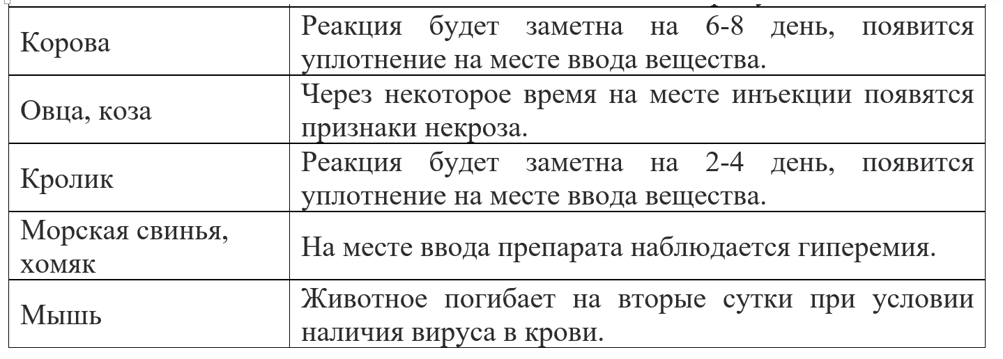 Отбирают патматериал из воспаленного кожного бугорка, выращивают на культуре тканей. Полученную субстанцию вводят тестируемым животным. Диагноз считают подтвержденным, если получается результат, соответствующий данным таблицы.