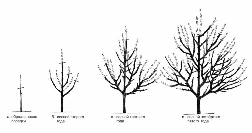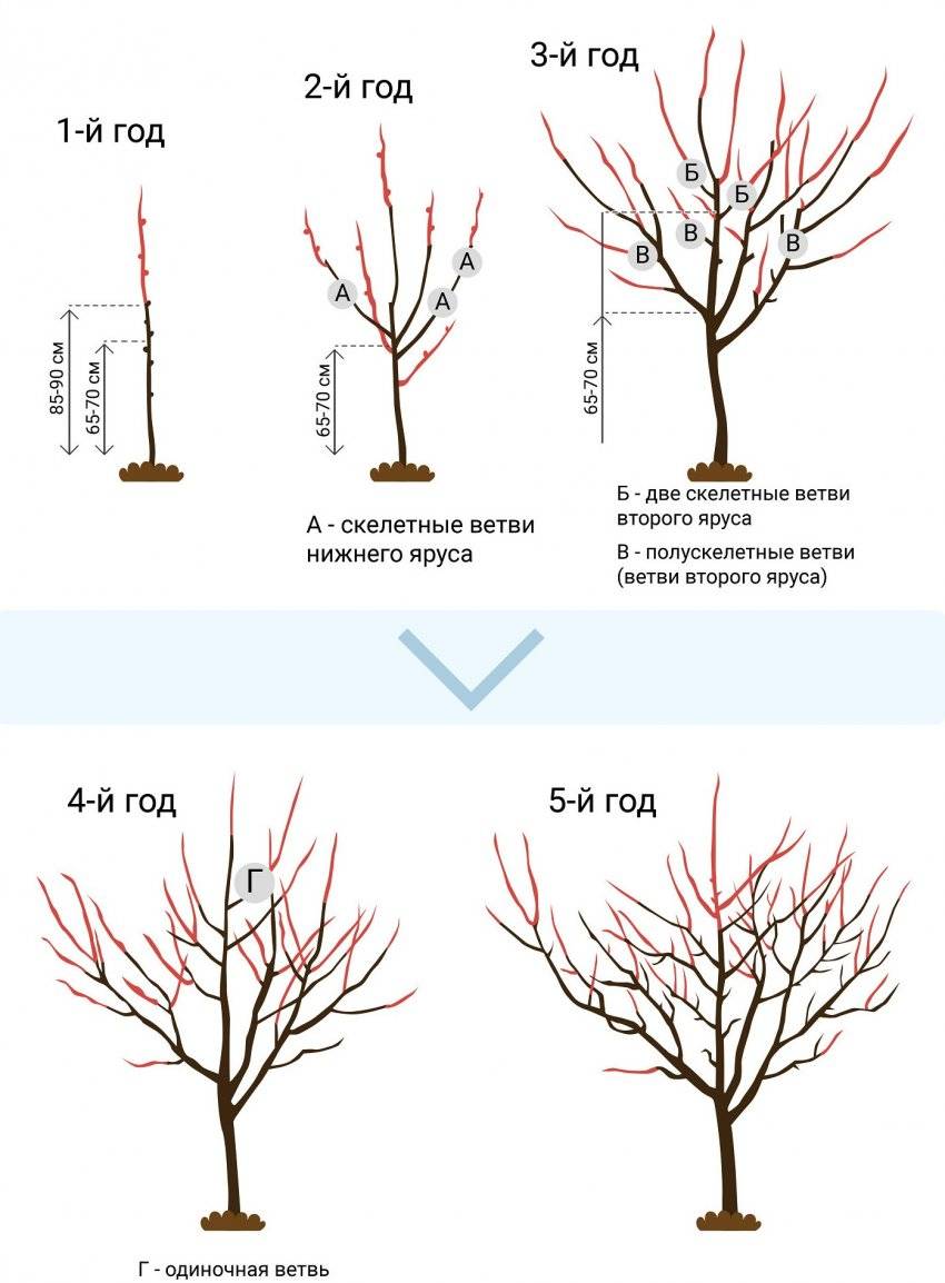 Первые несколько лет особенно важны для формирования кроны. В течение 6-7 лет нужно сформировать 5-7 основных ветвей, которые будут расположены на расстоянии минимум 50 см друг от друга.