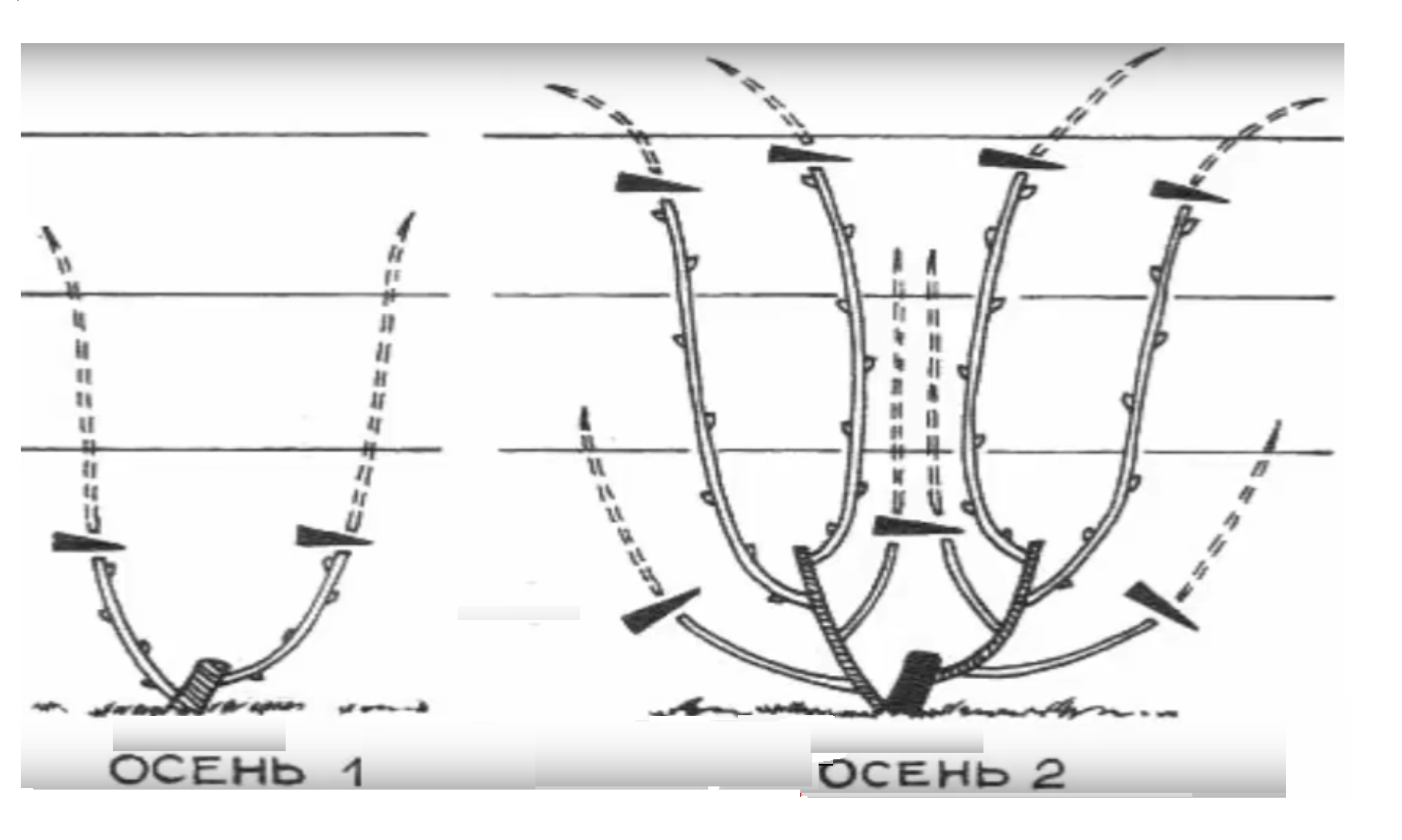 Формирование виноградного куста в первые два года жизни выглядит следующим образом: