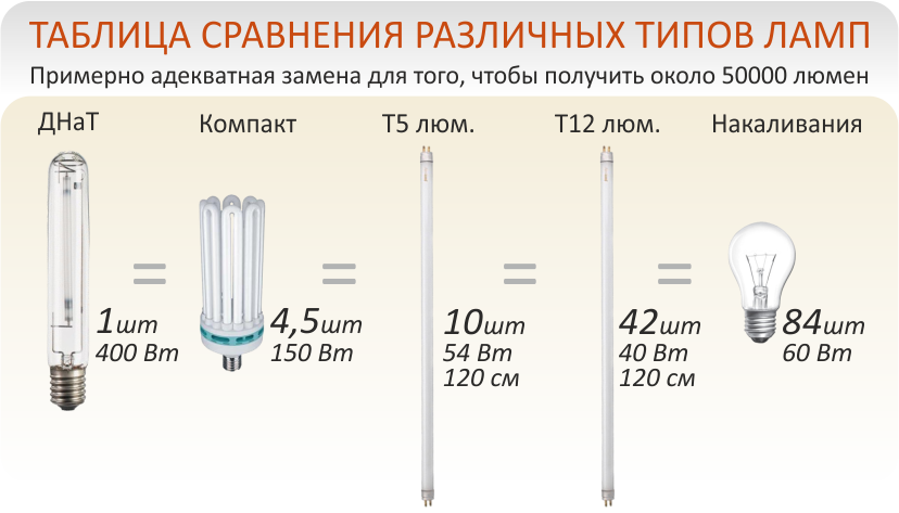 Важно подобрать не только марку лампы, ее вид, но и рассчитать количество, необходимое для освещения места, например, подоконника, стеллажа с рассадой или теплицы. Рассмотрим простой пример, зная, что растениям для нормального развития необходимо 8000 люкс:
