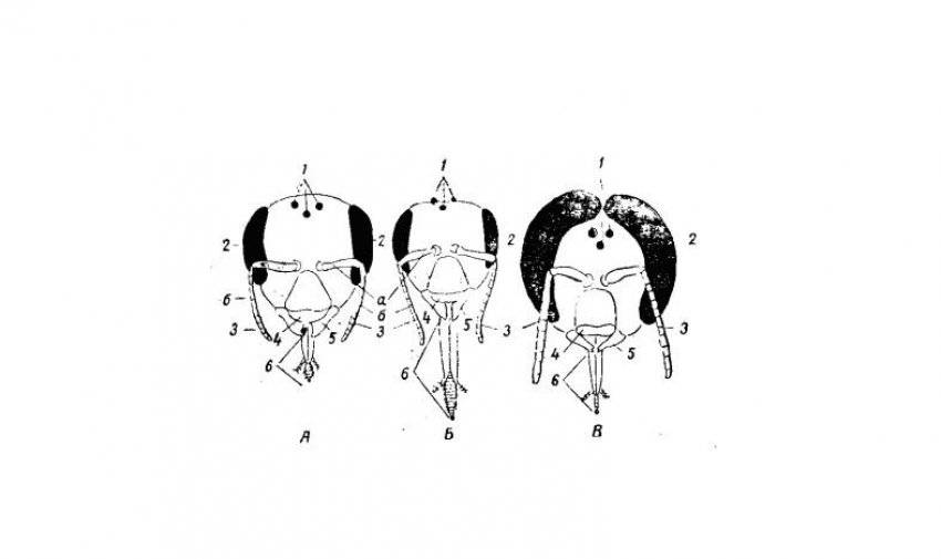 Схематическая иллюстрация головы пчелы (голова матки (А), рабочей пчелы (Б) и трутня (В): 1 — простые глаза, 2 — сложные глаза, 3 — усики, а — основной членик, б — жгутик, 4 — верхняя губа, 5 — верхняя челюсть, 6 — хоботок):