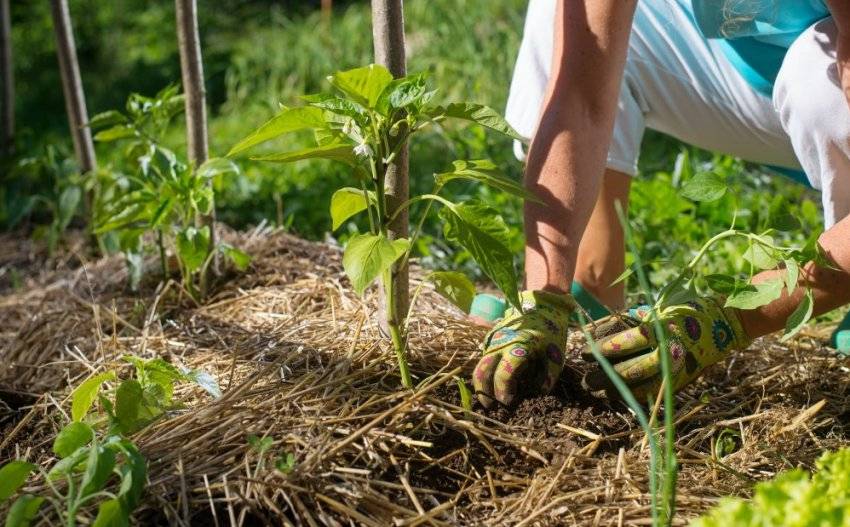 Окучивание низкорослым перечным кустикам не нужно. А вот пропалывать их от сорных растений следует регулярно. После каждого полива грядки укрывают мульчей из сена или соломы, что позволяет уберечь корни от перегрева и сохраняет влажность почвы.