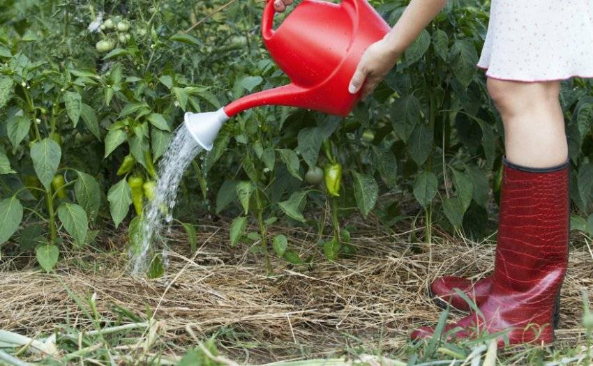 Поливать кусты перца нужно утром либо вечером, тёплой (22–25 °С) отстоянной водой. Полив следует проводить дождеванием, однако во время цветения — исключительно под корень, чтобы не смыть пыльцу.