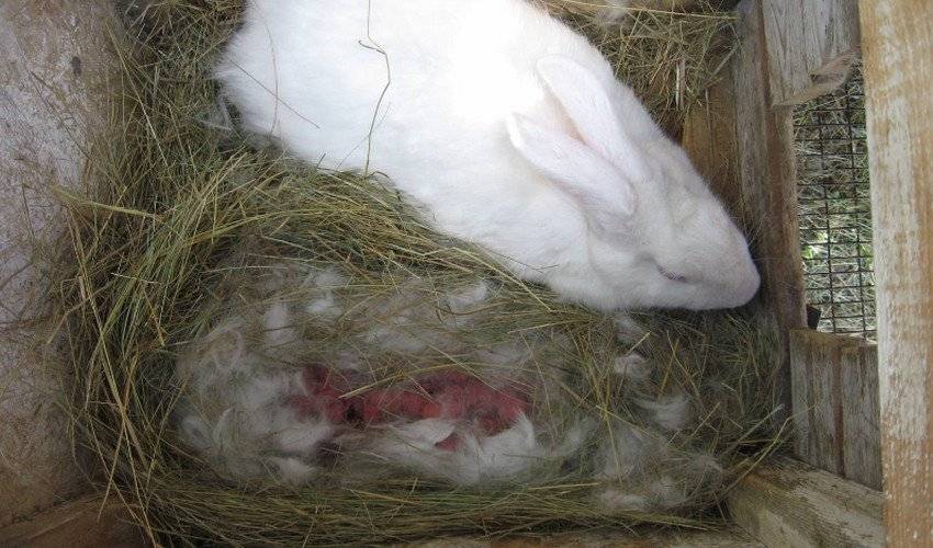 За несколько дней до родов необходимо установить в клетку специальный ящик, который будет выполнять роль гнезда, где и произойдет окрол. Дно выстилают соломой или сеном в достаточном количестве. Как правило, самки добавляют еще и свой пух для утепления. Если крольчиха по каким-то причинам не сделала этого, то такая работа возлагается на фермера.