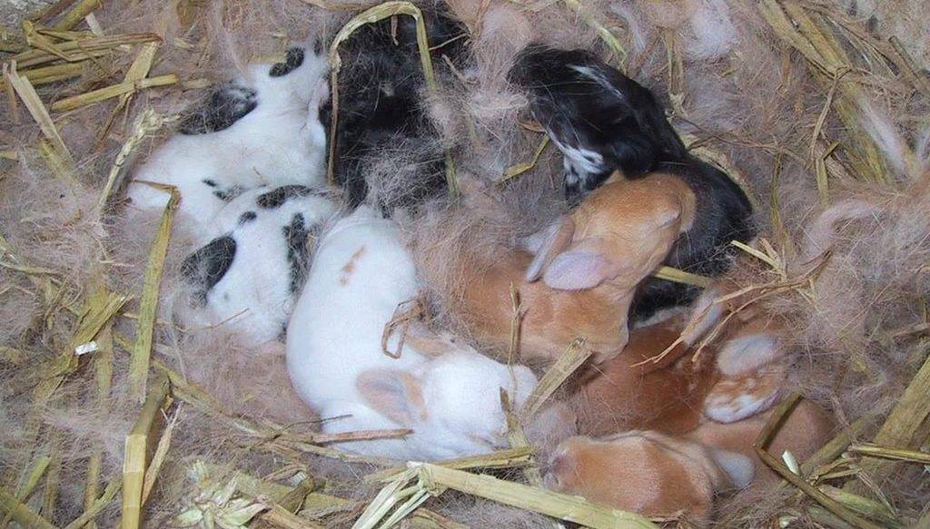 Перед самым рождением крольчат будущая мать выщипывает у себя на животе пух для того, чтобы укрыть детенышей. После нормального окрола малыши лежат в центре гнезда кучкой, щедро укрытые пухом.