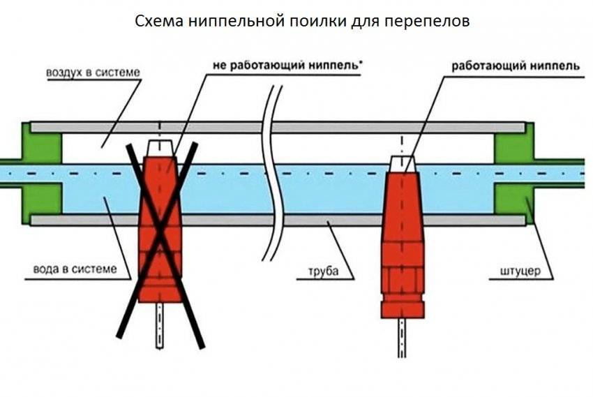 Для перепелов из-за их малого веса подойдут покупные сдвоенные ниппельные поилки с каплеуловителями, соединяемые с помощью отрезков полипропиленовых труб в единую магистраль, длина которой не должна превышать ширину клетки. С одной стороны на магистраль устанавливается заглушка, с другой – пластиковая втулка со штуцером для подсоединения шланга. Вода в магистраль подаётся по шлангу из пластиковой канистры, установленной выше ниппельных поилок.