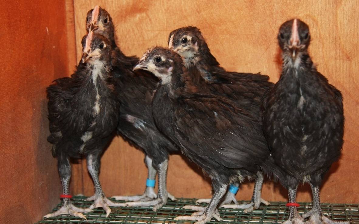 Цыплята появляются на свет с серо-чёрным пухом, их вес составляет 40 г. Как только малыши обсохнут, их помещают в брудер и держат при температуре около +30 ºС. Первое кормление организуют через 10 часов после того, как птенцы вылупятся из яиц.