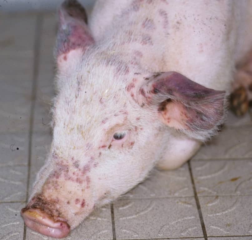 Пятна могут иметь форму квадратов или кругов, проступают в области головы, туловища спустя день после заражения. Если на них надавить, становятся бледными. Болезнь длится до 12 дней, при самых хороших обстоятельствах свинья выздоравливает через 48 часов.