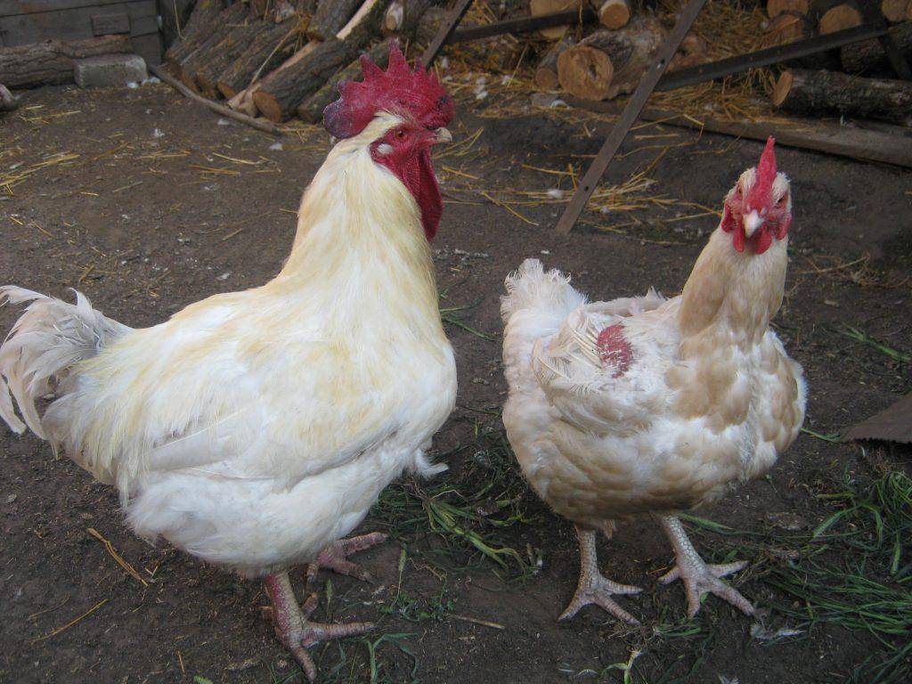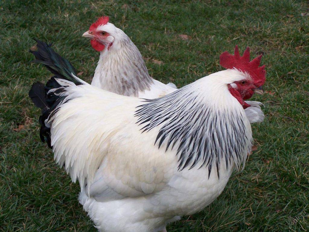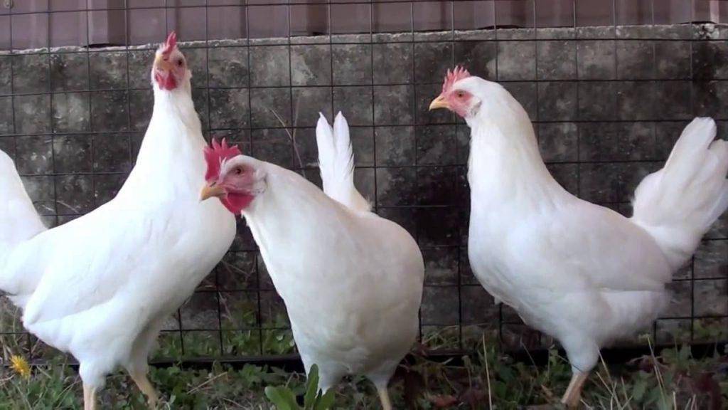 Куры этой породы с большим гребнем, окрас перьев белый.