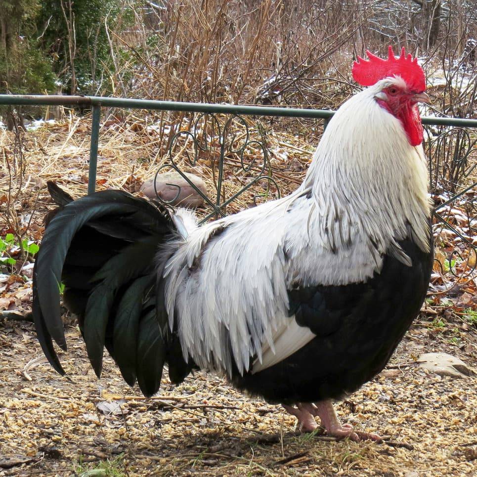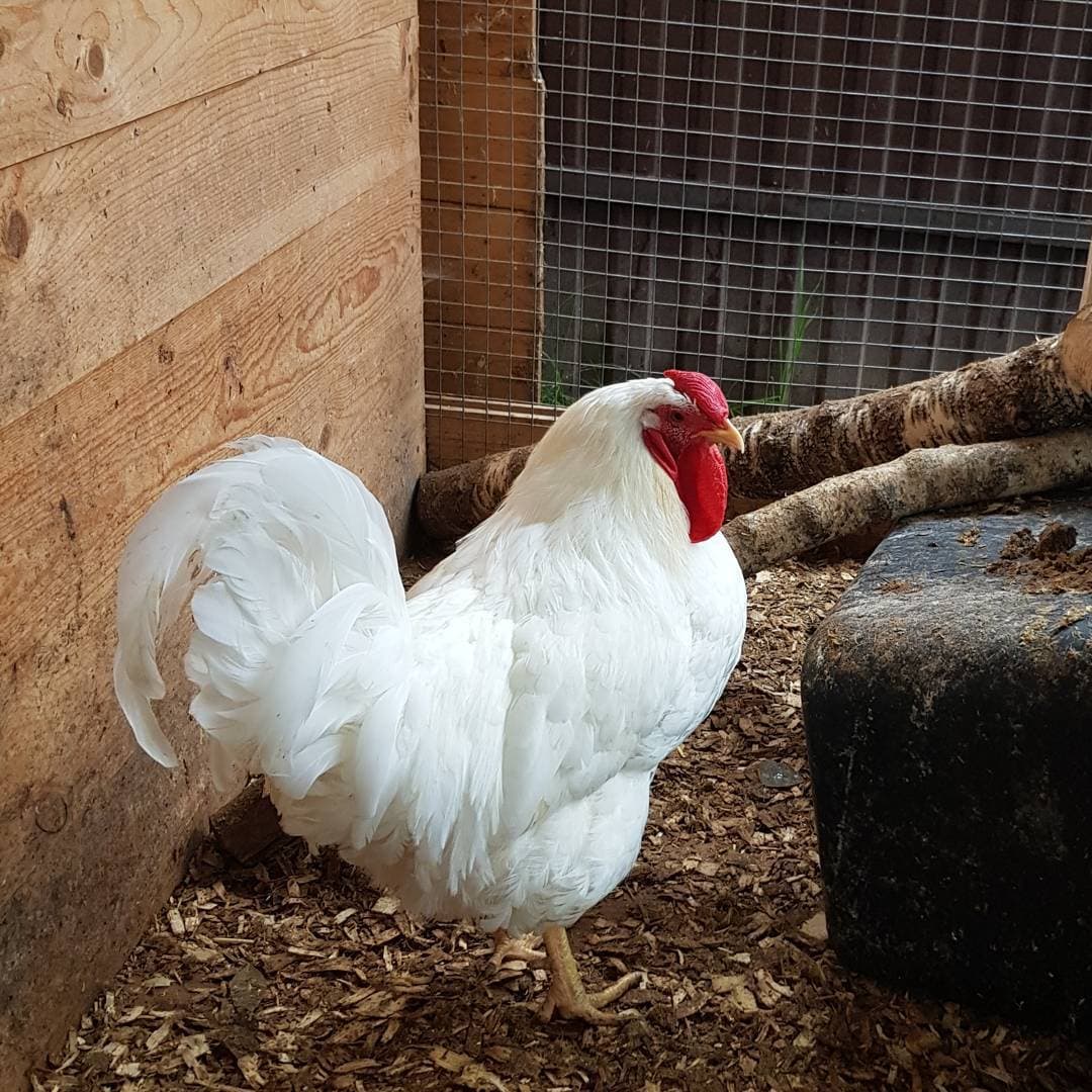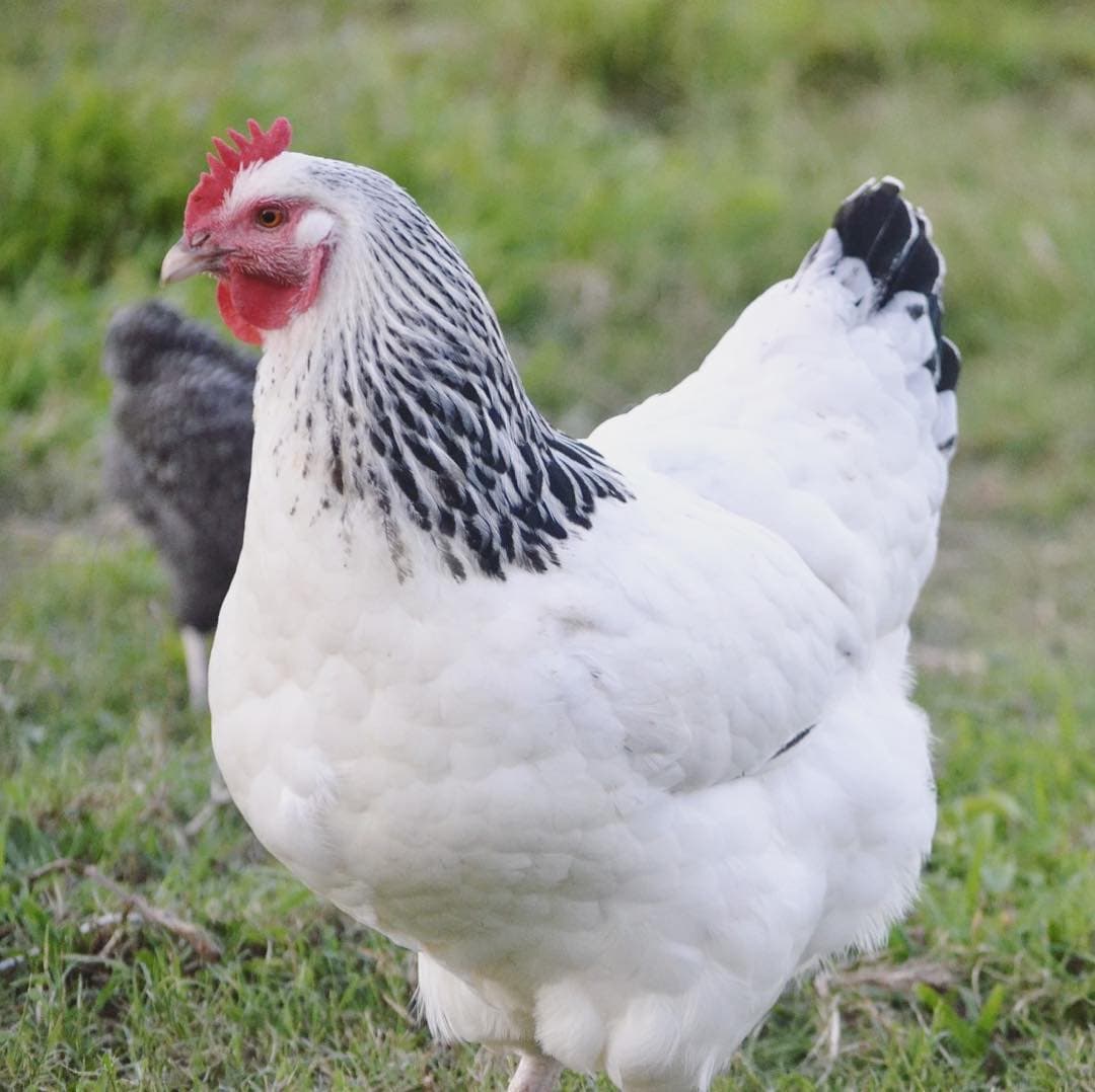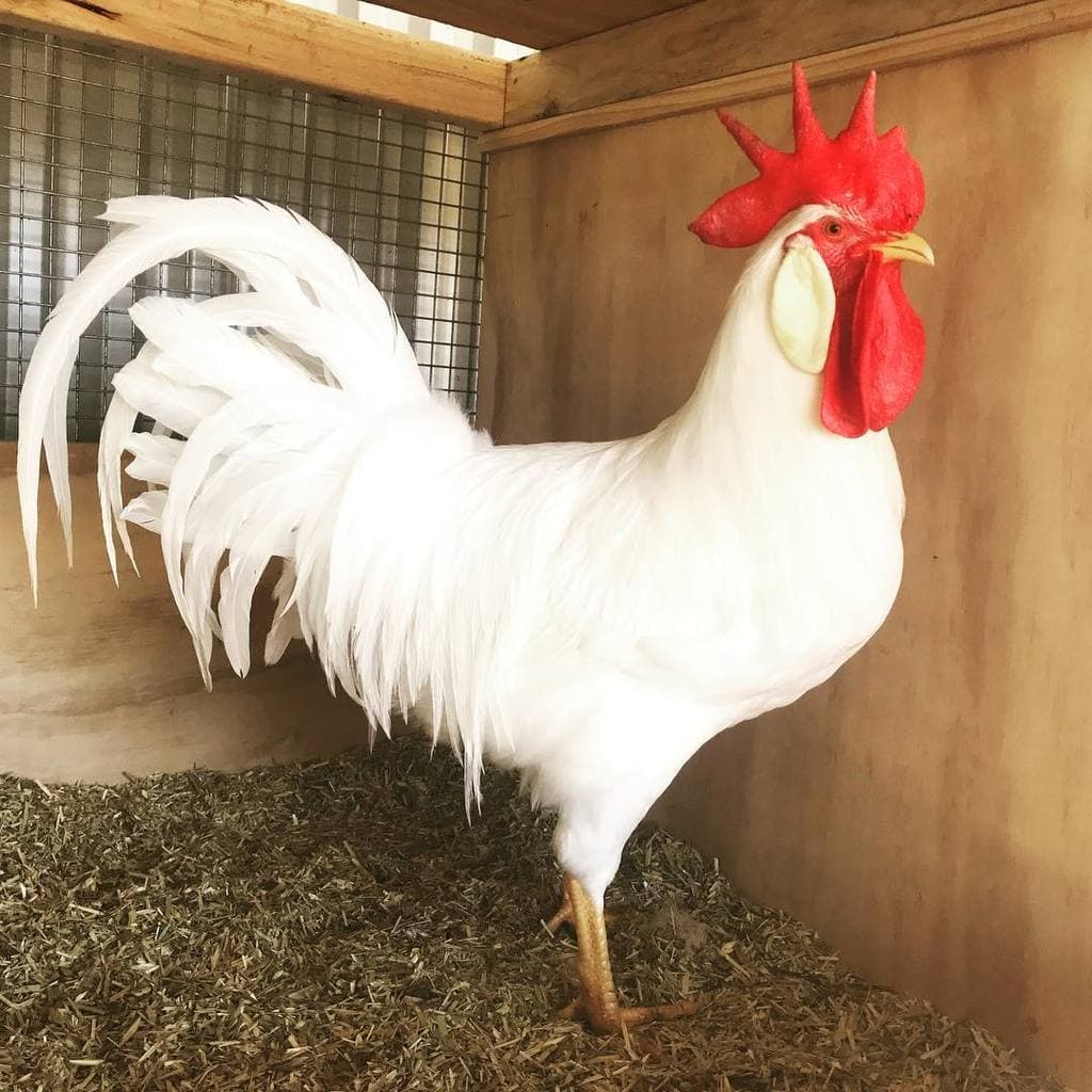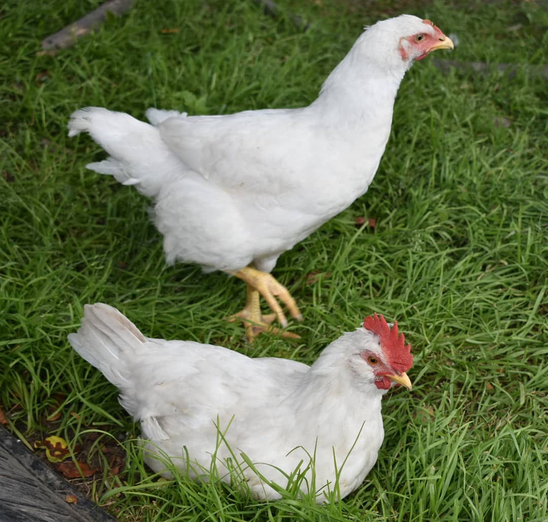 - Американские белые плимутроки. Порода родом из США. Птицы могут иметь различный окрас (4 расцветки), самыми продуктивными считаются именно белые куры. Взрослый петух может иметь вес до 4 кг, куры – около 3 кг. Яйценоскость кур составляет около 180 штук в год.