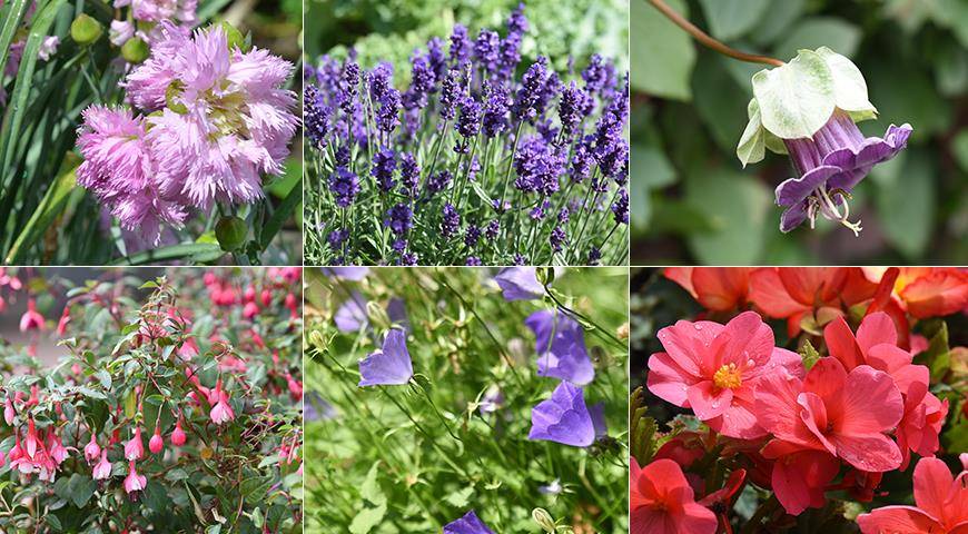Гвоздика Шабо, лаванда узколистная, кобея, фуксия, колокольчик карпатский, бегония клубневая