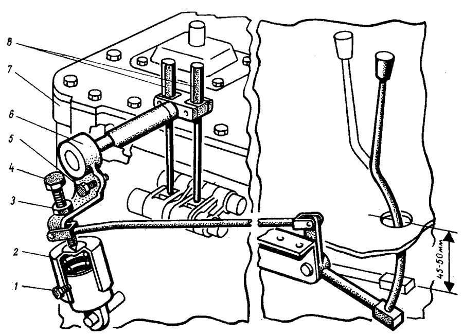 При разборке стакана с установленной в нем сжатой пружиной соблюдают осторожность и операции выполняют в определенной последовательности. Сначала переводят рычаг управления ВОМ в положение, при котором совмещаются технологические отверстия в рычаге 5 валика переключения и заднем мосту, и заворачивают в них установочный болт 1
