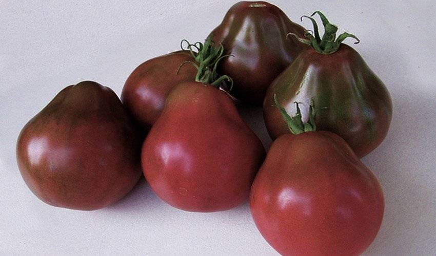 Плоды ребристые, грушевидной формы, оригинального темно-бурого, почти черного цвета. По отзывам, томаты очень сладкие, хороши для салатов и консервирования.