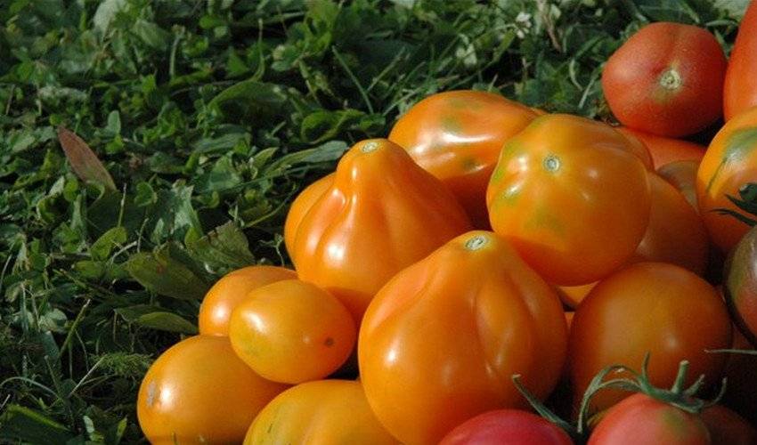 Вес одного помидора достигает 200 граммов. У некоторых видов во вкусе присутствует кислинка. Кожица плотная, под ней мясистая упругая мякоть. Ребристость слабо выраженная.