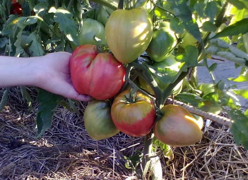 Не все плоды такие огромные, большинство из них весит не более 300 г. Помидоры имеют любимую всеми сердцевидную форму. У плодов можно заметить небольшую ребристость. Зеленые пятна можно увидеть на незрелых помидорах. У созревших томатов оно отсутствует.
