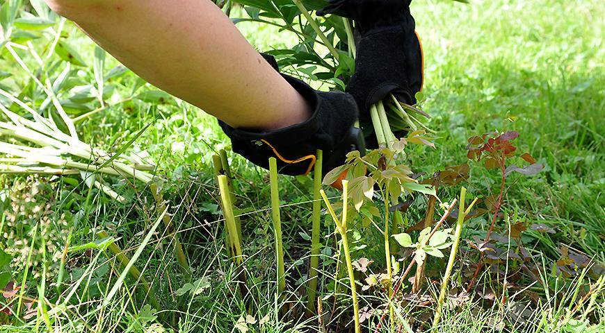 Обрежьте многолетние цветы (пионы,флоксы, ирисы, лилейники, вероники, пасконники и т.д.) на зиму, оставляя побеги длиной примерно 8-10 см.