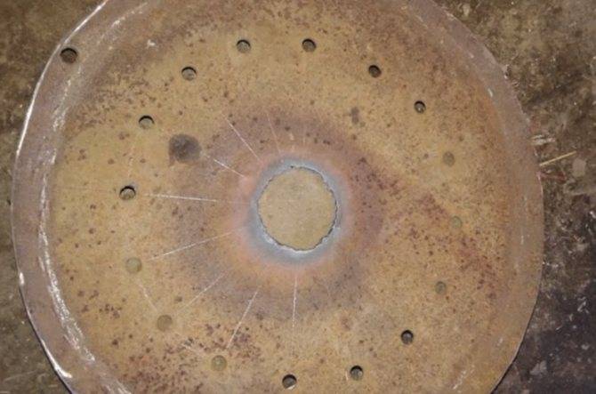 В качестве самого ротора будет использоваться металлический автомобильный диск, к корпусу которого нужно приварить 10 одинаковых по длине и толщине трубок таким образом, чтобы получить в итоге своеобразное «солнце», то есть трубки должны немного выходить за пределы диска.