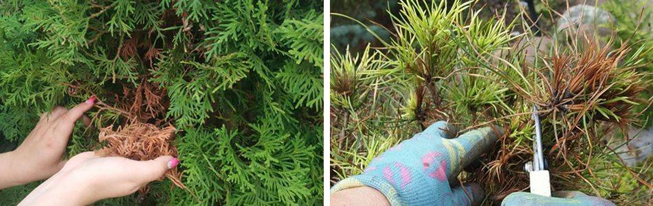 Сильно страдают от этого: ель канадская Коника, многие сорта можжевельника китайского, скального, пихта корейская, тис ягодный.