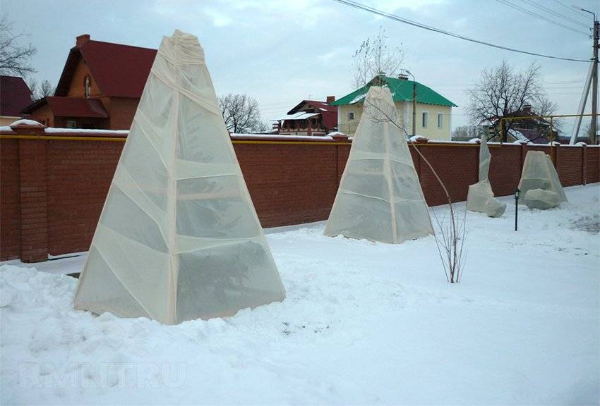 Укрывные материалы используют, натягивая на защитные экраны и ширмы. По кроне можно не туго обматывать проницаемыми материалами. Недорогой вариант — строительная фасадная сетка.