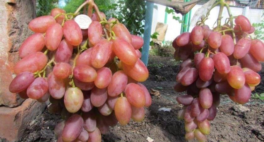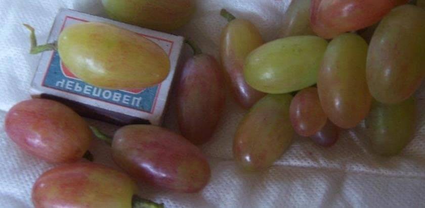 Цвет поспевающих плодов может быть разным — от розовато-желтого до чисто розового, встречаются бело – розоватые виноградины. Кожица у ягод достаточно плотная, но во время еды практически не ощущается.