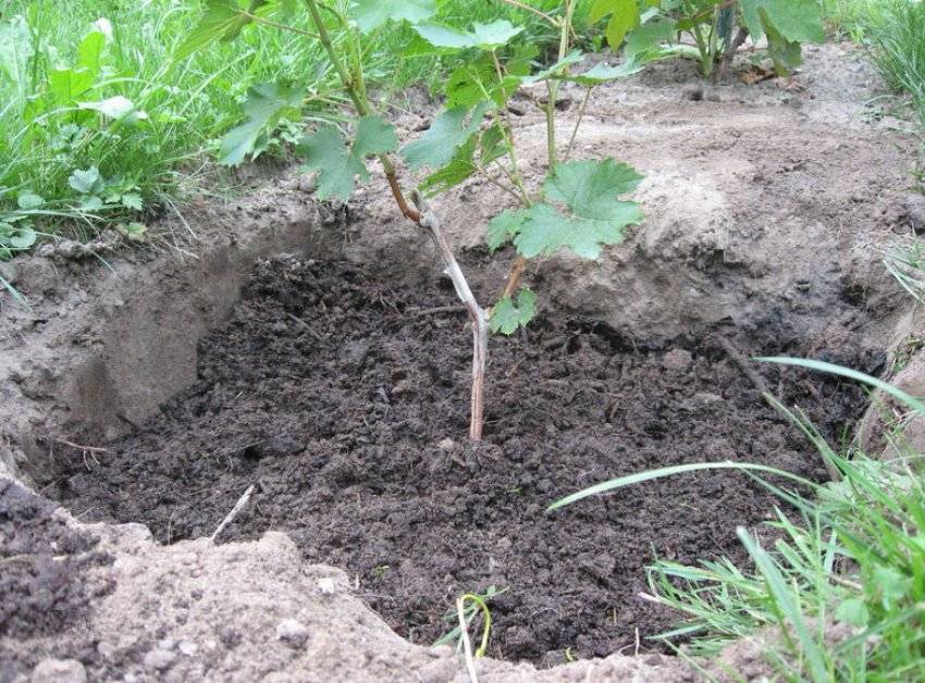 Если планируется осенняя посадка, почву для винограда готовят летом, не менее чем за два месяца, если весенняя, посадочные ямы для растений готовят в октябре. Сначала грядку глубоко перекапывают, не менее 60 см в глубину, удаляют сорняки, вносят перепревший навоз, в количестве от четырёх до шести кг на 1 м2. Весной виноград можно сажать при прогревании почвы до +10°С…+12°С. Готовят лунки диаметром и глубиной около 70 см. Далее поступают следующим образом: